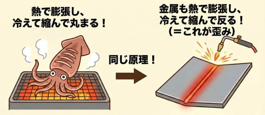 その後冷えると、今度は縮みます。しかも溶接した部分だけが強く縮むため、周りの材料を引っ張ってしまい、